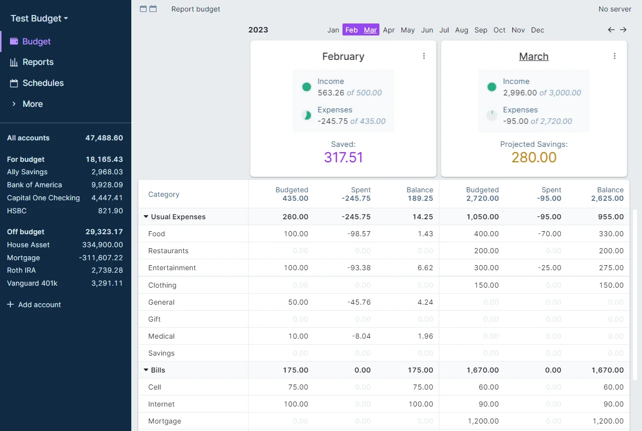 When a new month begins, your Projected Savings changes to Saved or Overspent, depending on your final transactions. The final savings amount calculated for this field is your actual income minus your actual expenses. If you hover your mouse over the Saved or Overspent text, you can view the breakdown of projected and actual savings for the month.